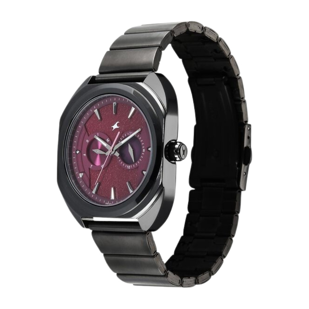 Fastrack Wild Analog with Burgandy Dial Gun Metal Strap Watch for Guys 3326QM02