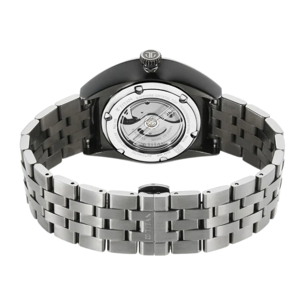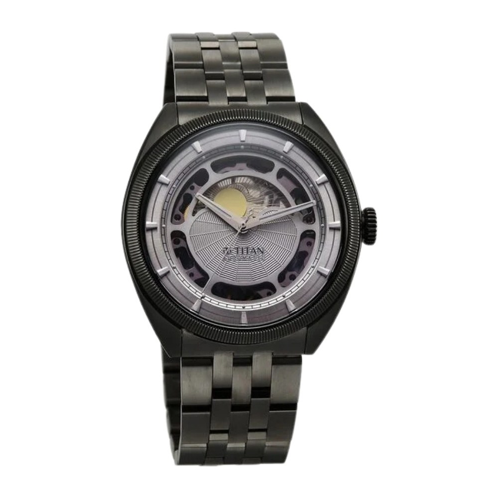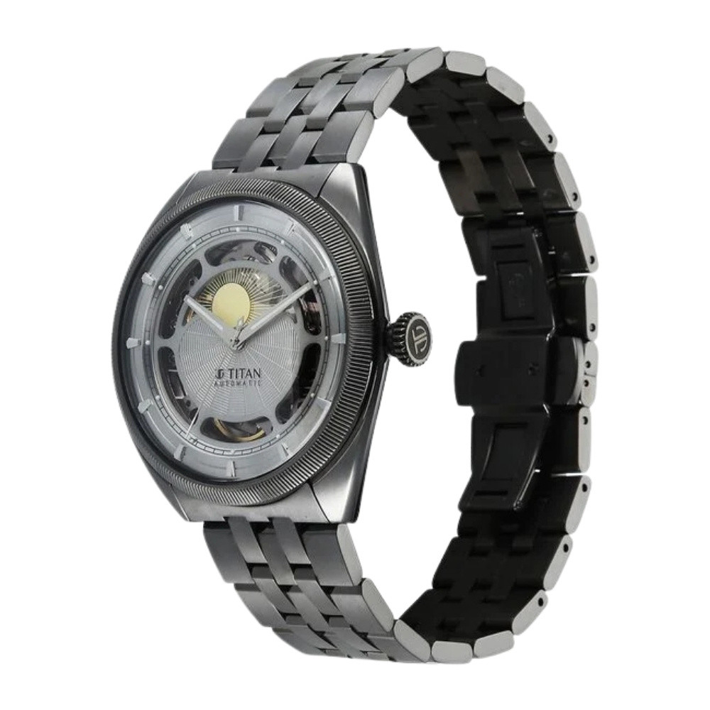 Titan Stellar Cupola Automatic Analog with Sun Moon Phase and Silver Dial Dark Gun Stainless Steel Strap Watch for Men 10011QM02